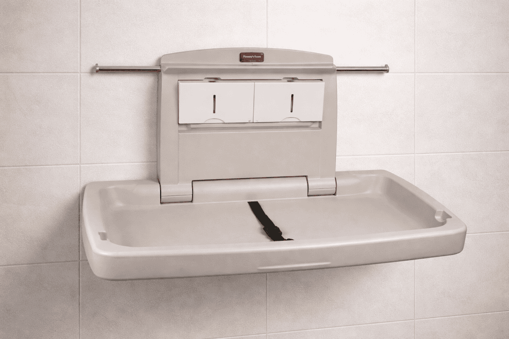 משטח החתלה עבור התינוק עשוי פלסטיק קשיח, נצמד לקיר ומתקפל בסגירה.