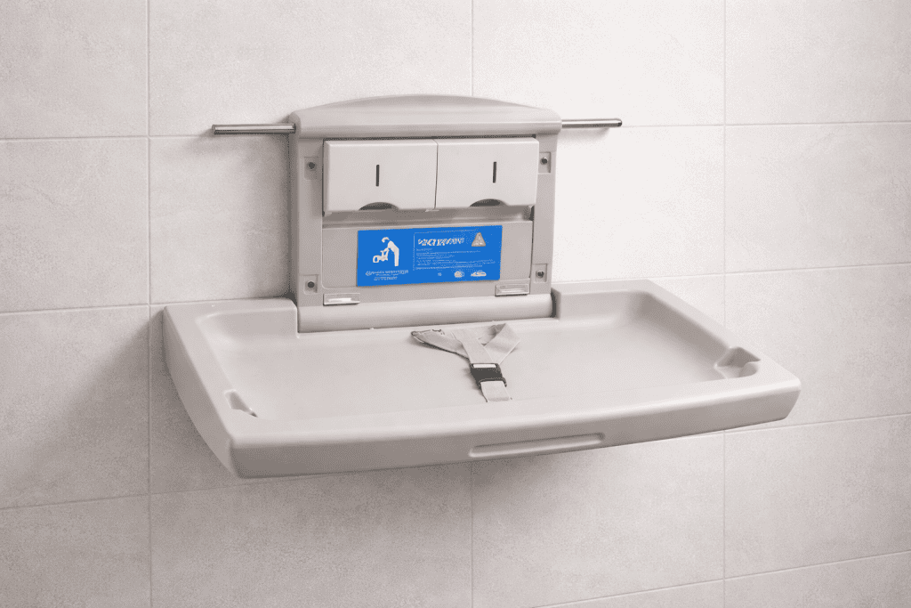 משטח החתלה לתינוק עשוי פלסטיק קשיח, נצמד לקיר ומתקפל בסגירה.